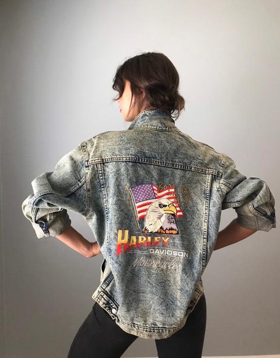 Vintage Harley Davidson Jean Jacket Large Retro Motorcycle Biker Denim Jacket Harley Born In The Usa America Flag